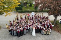 Am Samstag, 12.10.2024, fand die zweite Musikerhochzeit in diesem Jahr statt, Mo und Miri gaben sich in der Kirche in Unterzeil das Ja-Wort. Um 5.30 Uhr trafen wir uns um in Ellrazhofen vor dem neuen Zuhause der beiden anzuschießen. In der Garage gab es dann Frühstück. Die kirchliche Trauung begann um 14.00 Uhr. Anschließend begleiteten wir das Brautpaar mit der Musikkapelle Willrazhofen an das Feuerwehrhaus in Unterzeil. Hier spielten wir für die Gäste und das Brautpaar während des Sektempfangs auf. Gegen 17.30 Uhr ging es dann nach Reichenhofen in den Pfarrstadel zur abendlichen Hochzeitsfeier. In dem schön geschmückten Saal gab es dann leckeres Essen, Getränke und gute Musik. Bis spät in die Nacht wurde das Brautpaar gefeiert, gelacht und vor allem getanzt. Danke Mo und Miri, dass wir diesen besonderen Tag mit euch feiern durften.