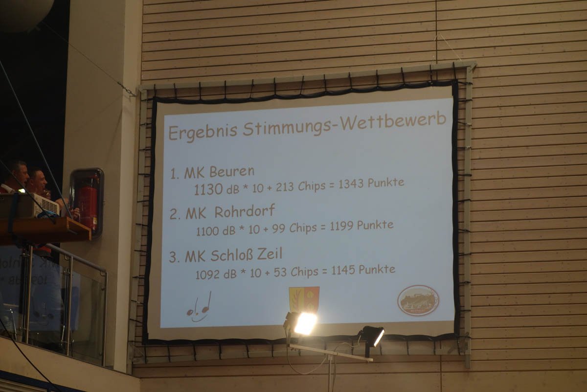 Wir Zeiler durften den Abend eröffnen und eine Stunde lang unser Unterhaltungs- und Stimmungsprogramm zum Besten geben. Gemeinsam mit unseren Sängern Andrea und Markus, einer Tanz- und Soloeinage konnten wir unterstützt mit vielen mitgereisten Fans aus Unterzeil einen gelungen Start in einen stimmungsvollen Abend darbieten. Gefolgt von den Kapellen aus Beuren und Rohrdorf fieberten wir der Auswertung durch die zahlreich erschienen Zuhörer entgegen. Der Sieger berechnete sich aus einer Lärmpegel-Messung und der Anzahl an abgegeben Chips pro Kapelle.